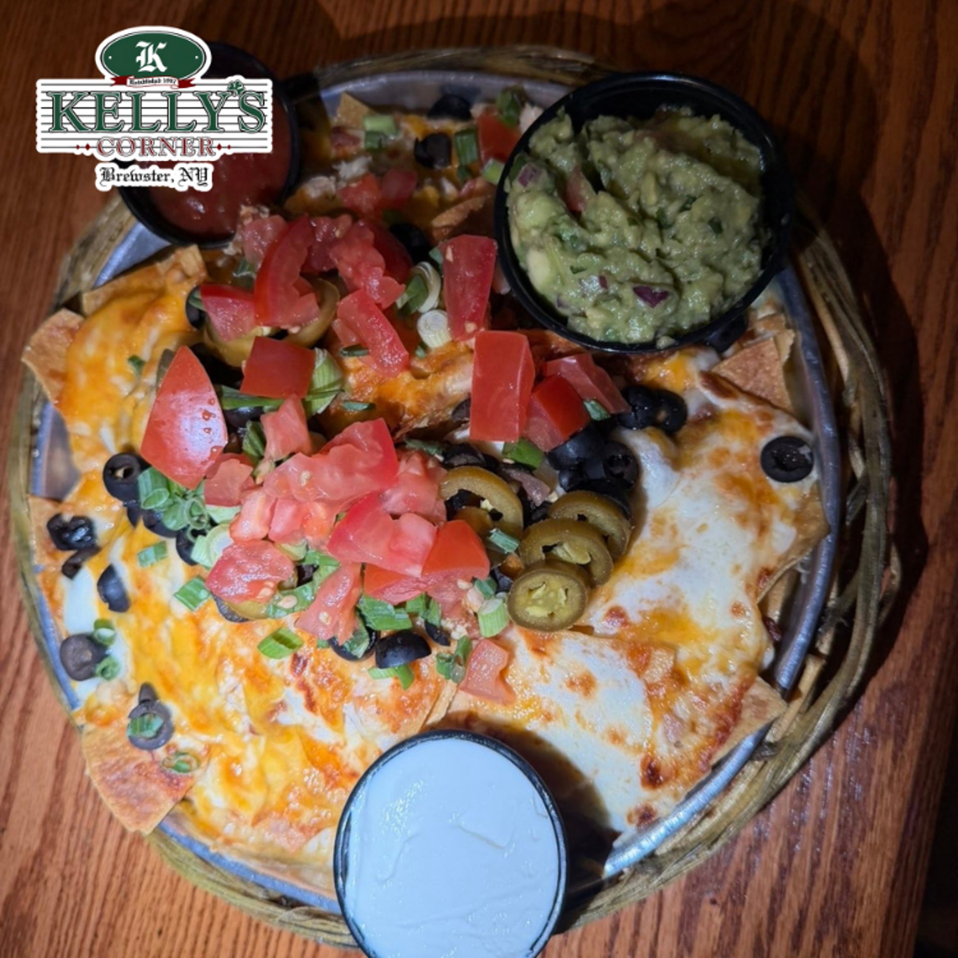 Baked tortillas with three types of cheese, tomatoes, scallions, olives, jalapeños and sides of salsa and sour cream